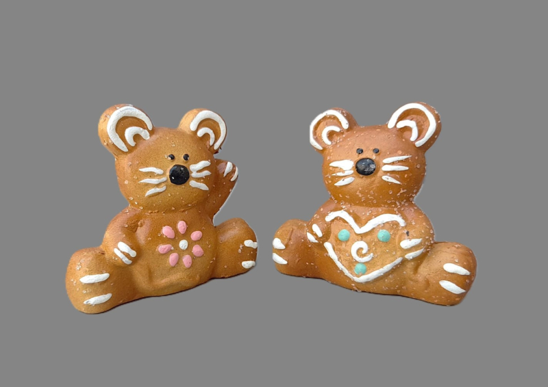 Gemaakt van Keramiek en in vrolijke kleuren beschilderd . Daarna gespikkeld met witte korrels. Door de diverse uitvoeringen is de set onderverdeeld in zittende en staande peperkoekmuisjes