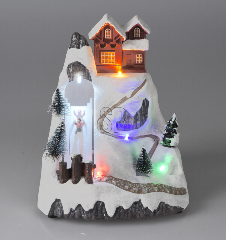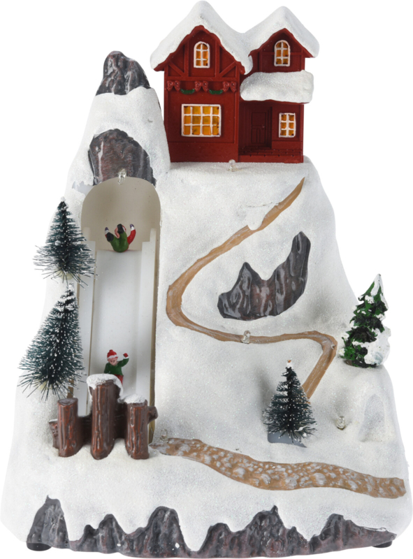 Dit leuke Wintertafereel met Glijbaan is een ideale aanvulling voor jouw miniatuur kerstdorp. Het tafereel is voorzien van gekleurde ledlampjes en de glijbaan beweegt waardoor het lijkt alsof de kinderen van de berg afglijden.